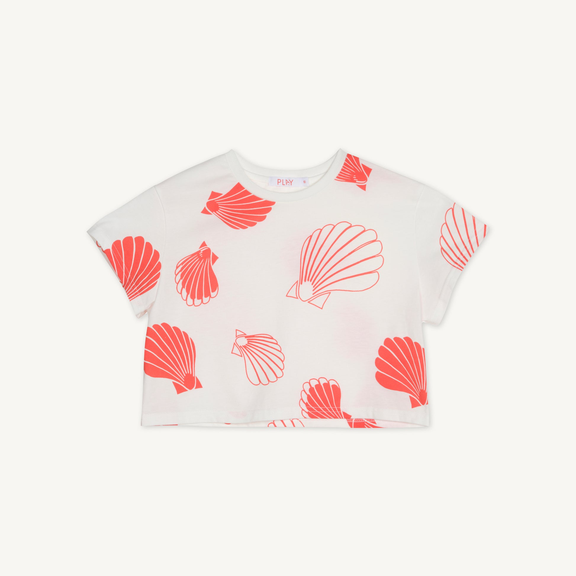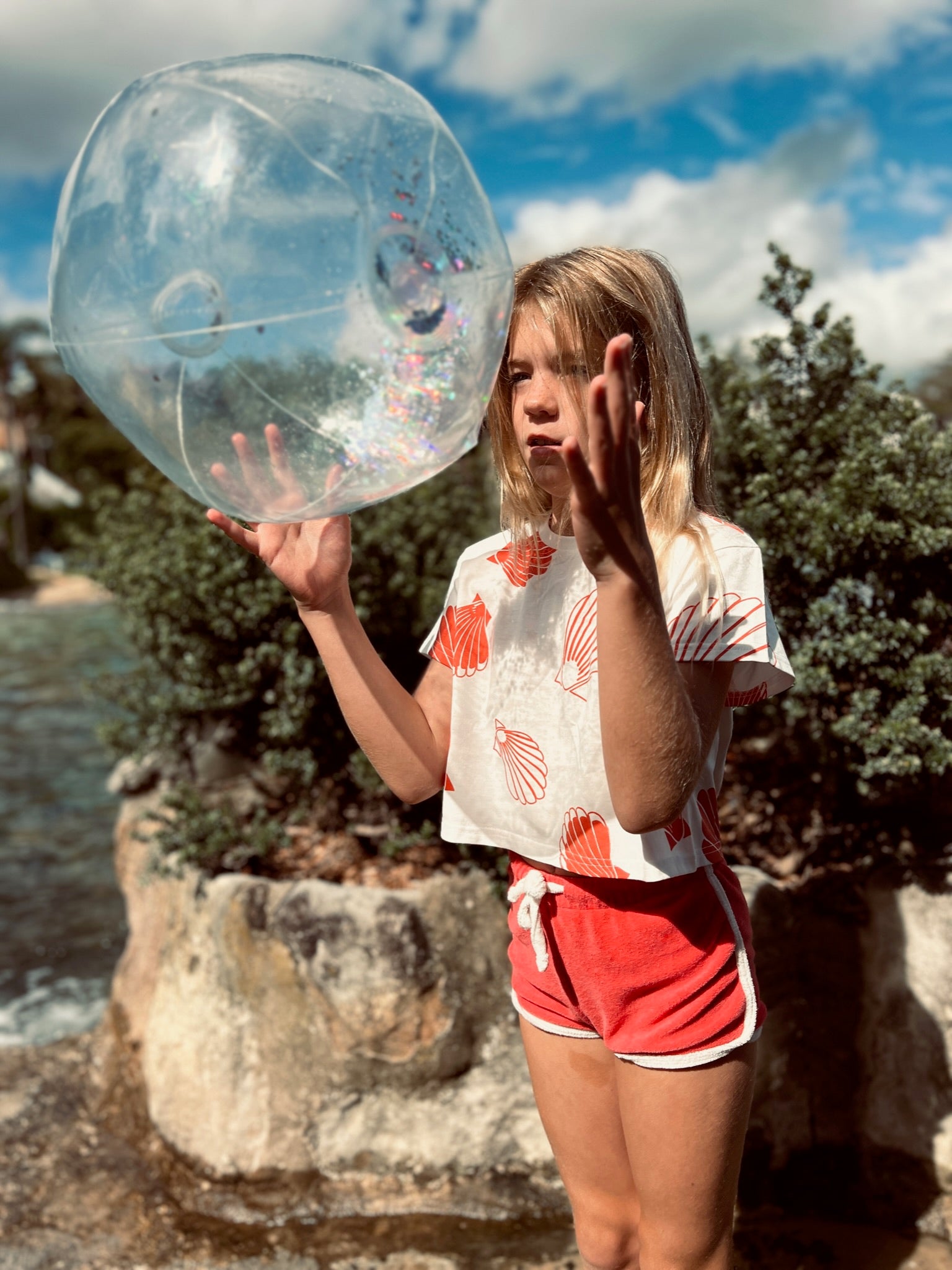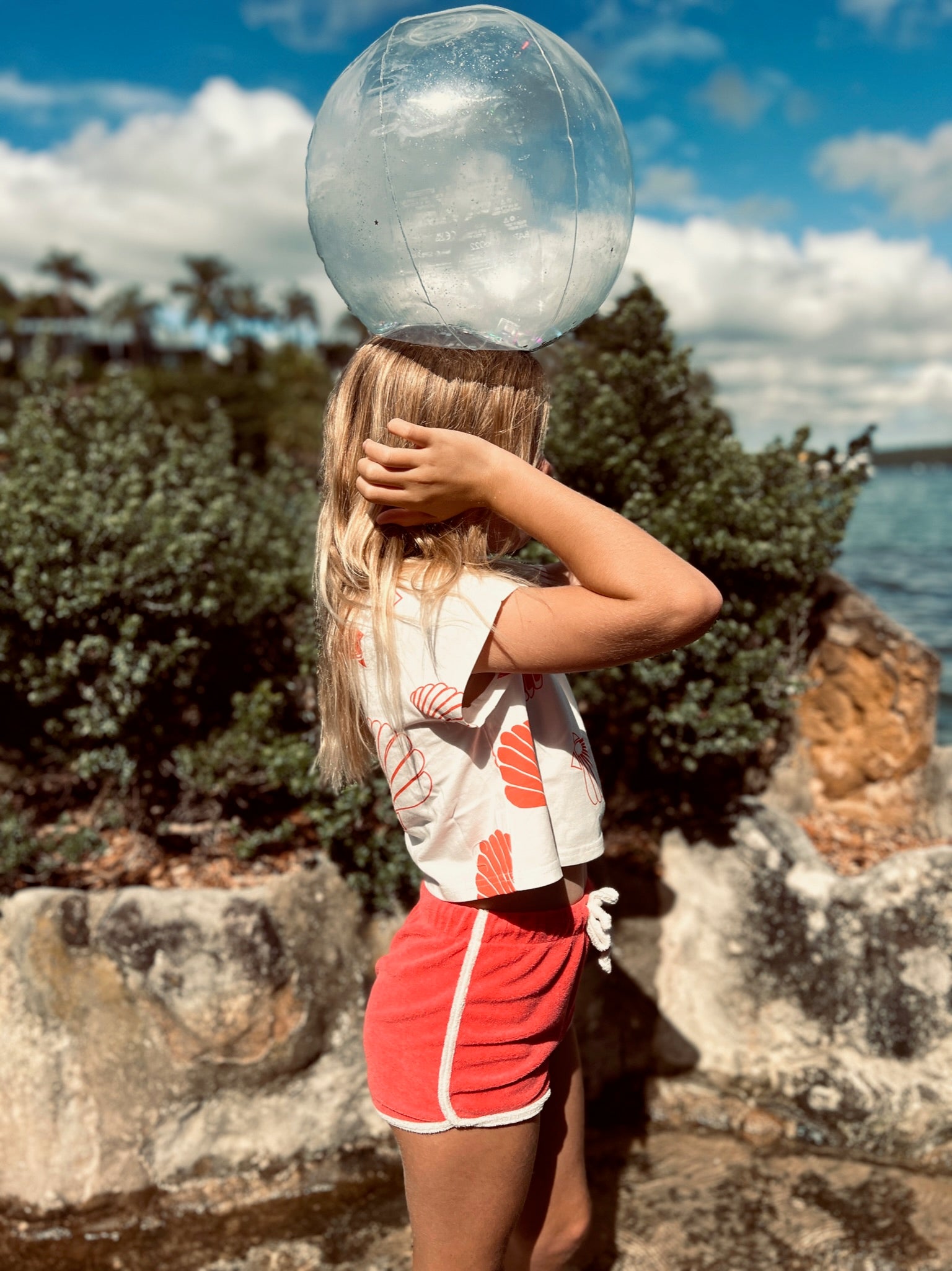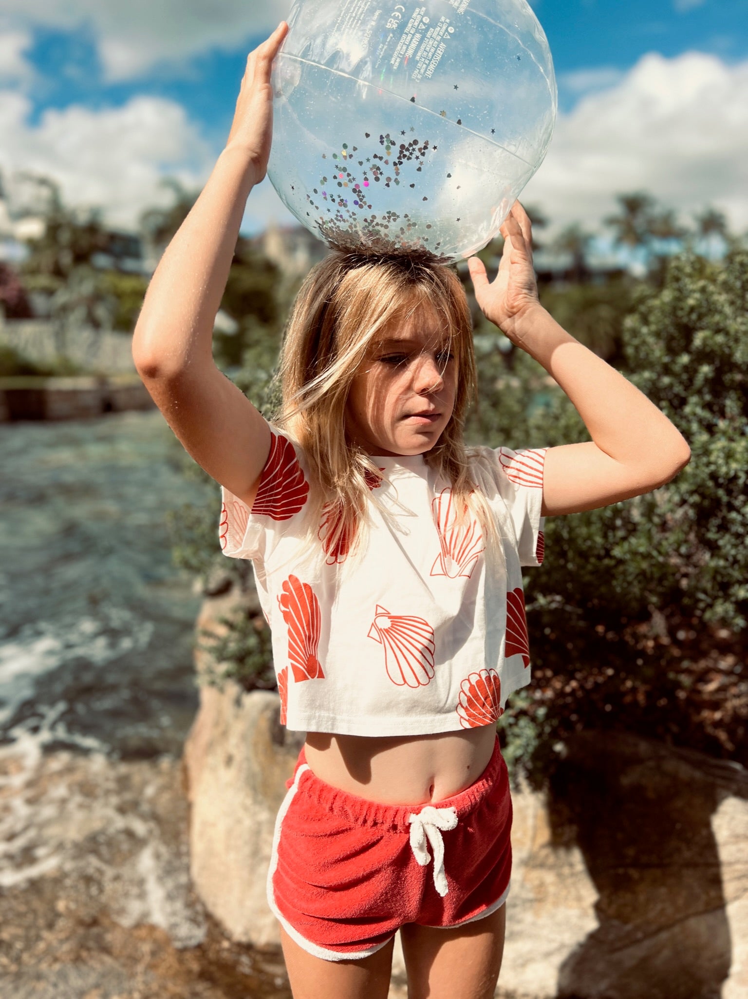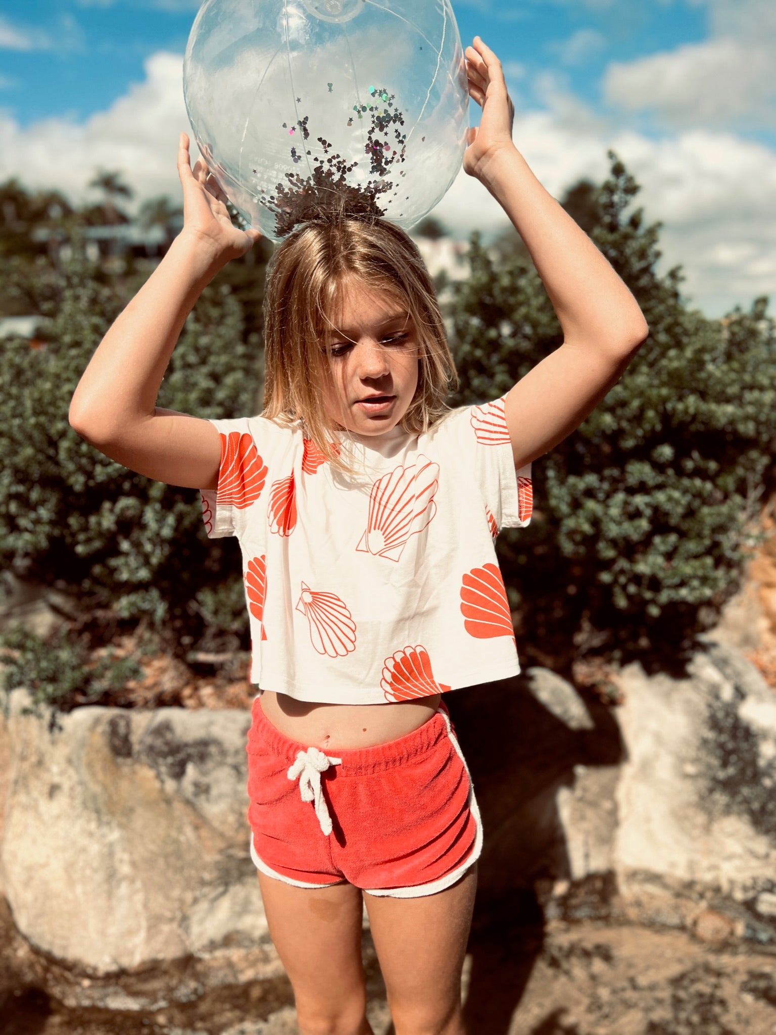 Prepare to see a lot of this tee over summer! Our new crop tee sits at the belt-line so it’s crop enough for kids, but not too crop for parents. Wear back with the matching clam print summer pants or with our red Terry Shorties