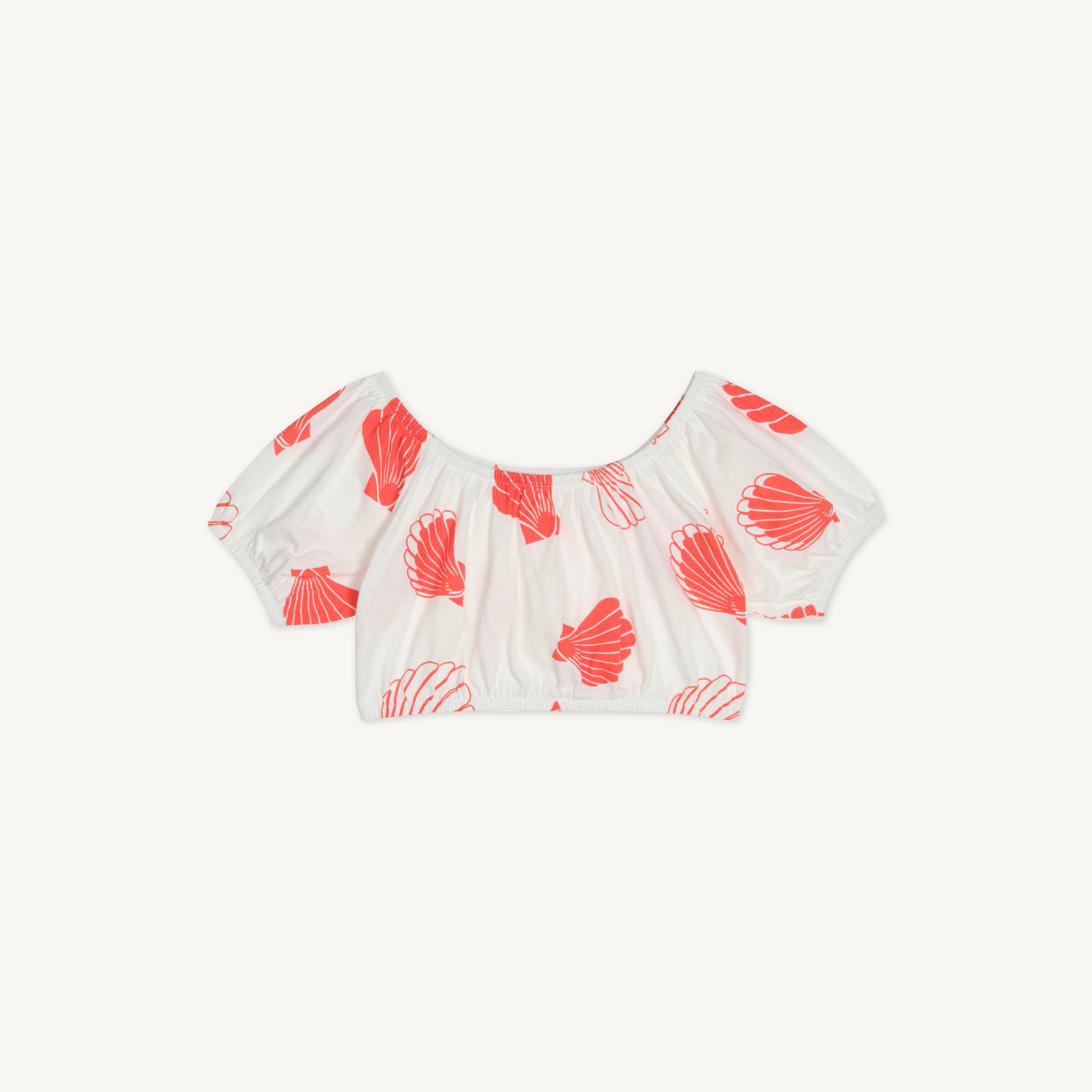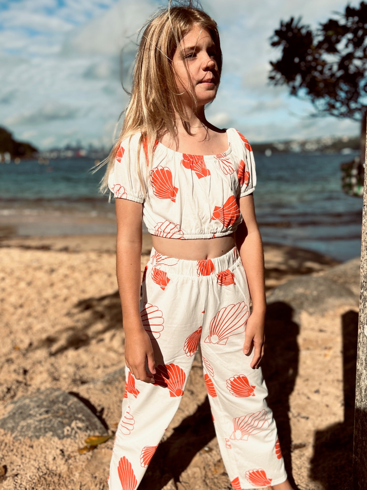 Sitting mid-tummy with peasant-style sleeves, this little crop looks ridiculously cute with the matching Clam Summer Pants.