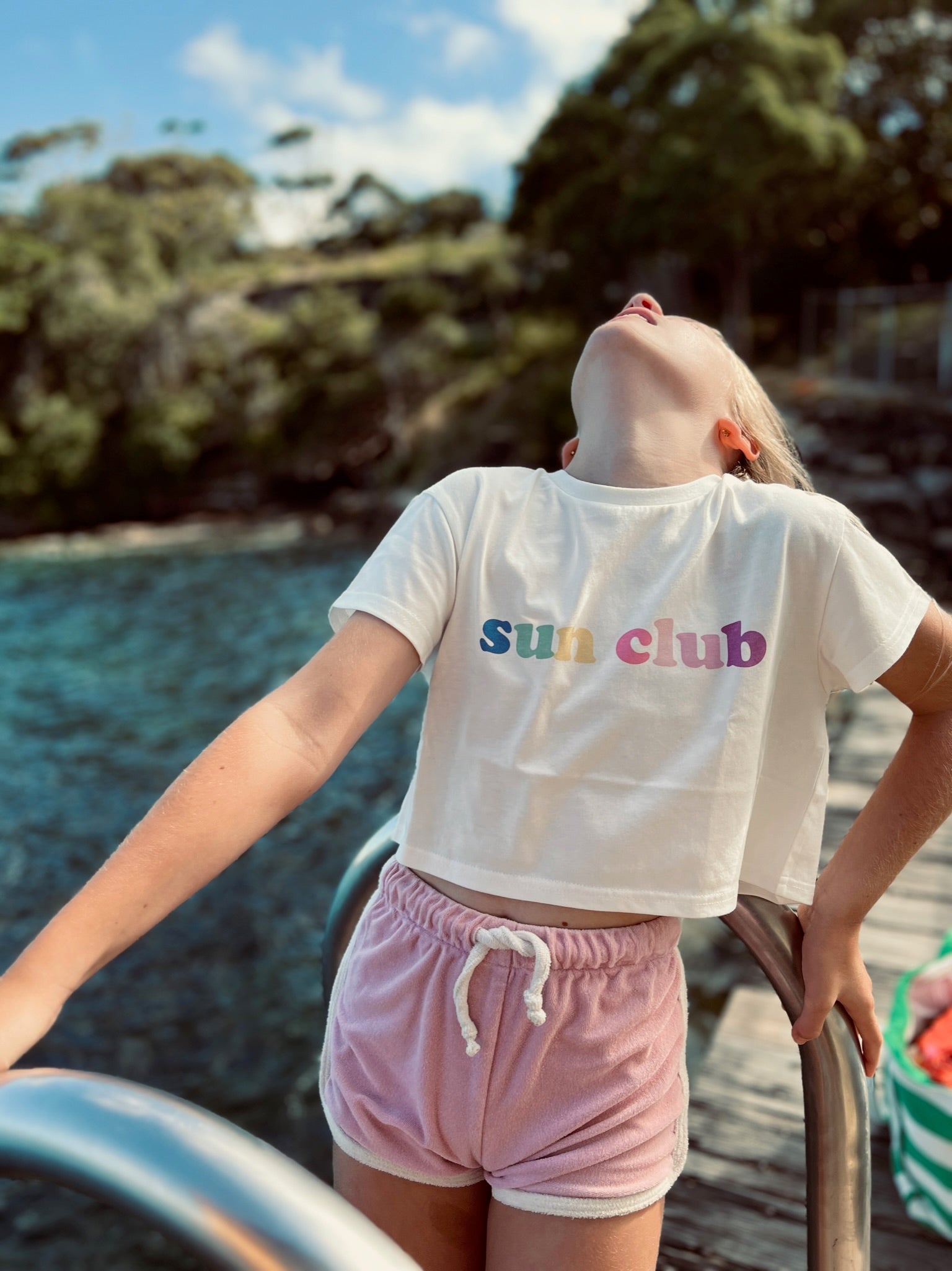 Sign us up, we definitely want to join this club! Our new Sunclub crop tee sits at the belt-line so it’s crop enough for kids, but not too crop for parents. Available in 2 colours. Wear back with any of our Terry Shorties.