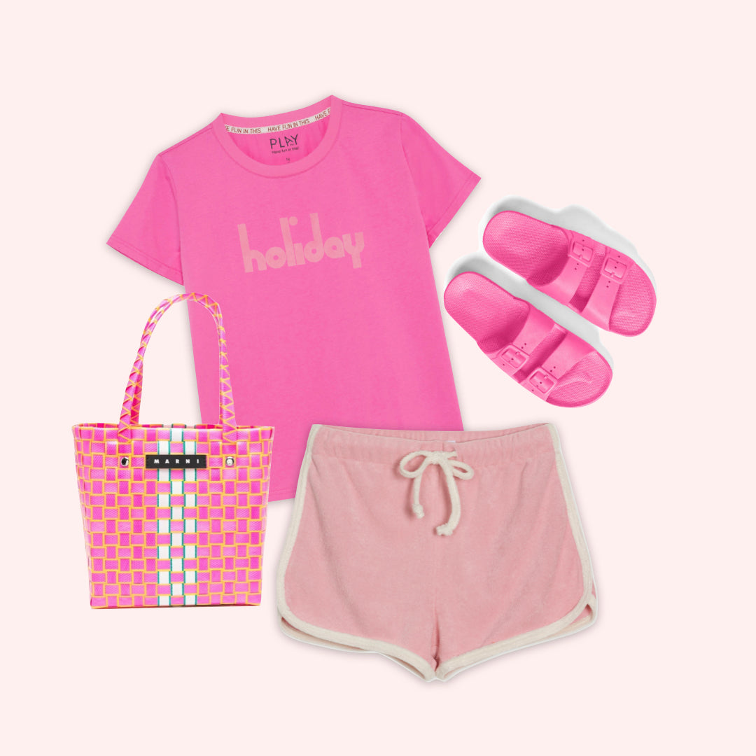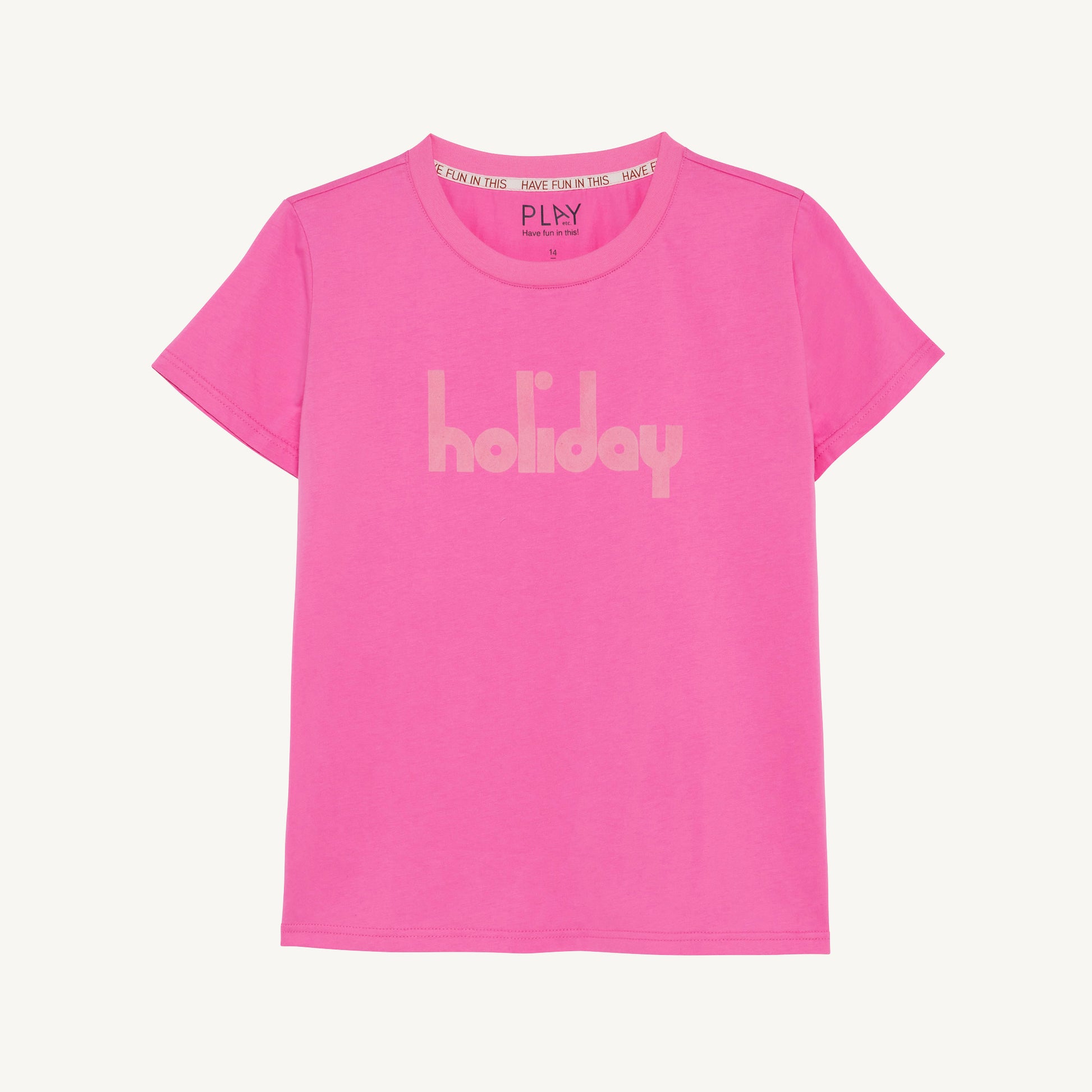 It's pink and screams holiday, what more could you want in a tee?! 100% cotton classic cut with pale pink flocked lettering.