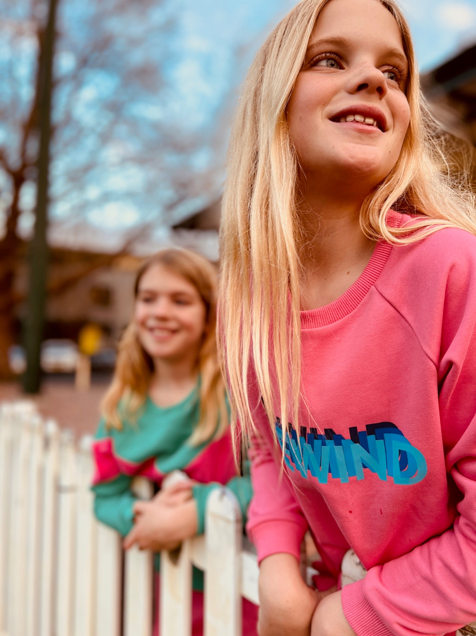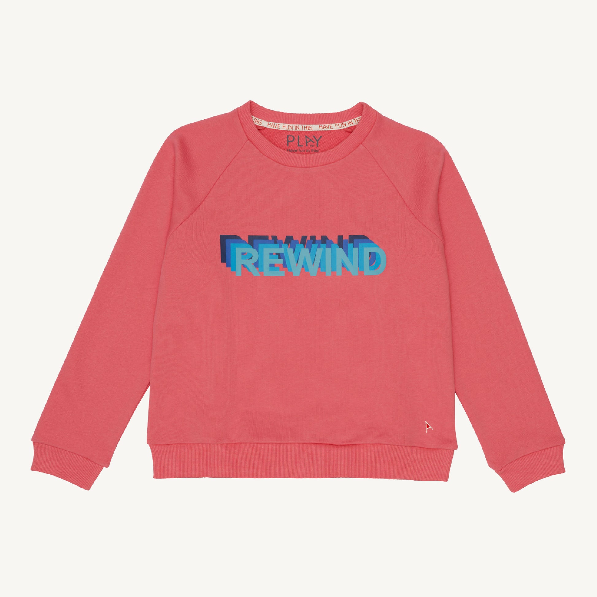 Rewind. Stop. Play. Pause. Inspired by our fave movies of the 80’s and 90’s, our pink Rewind sweater with screen printed graphic will be their go-to sweater of the season.