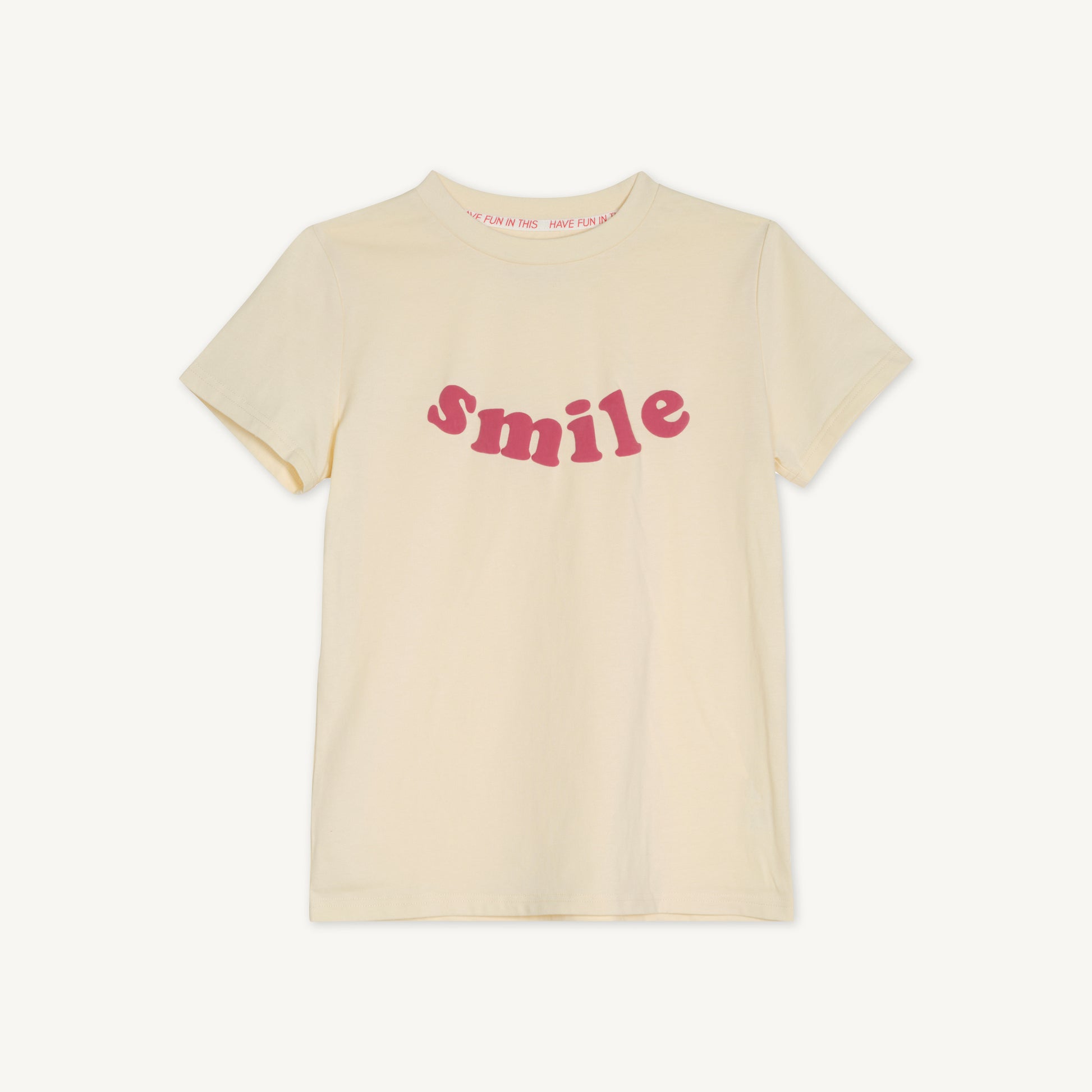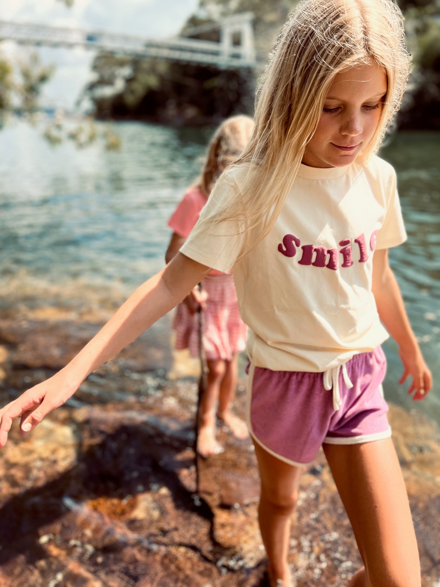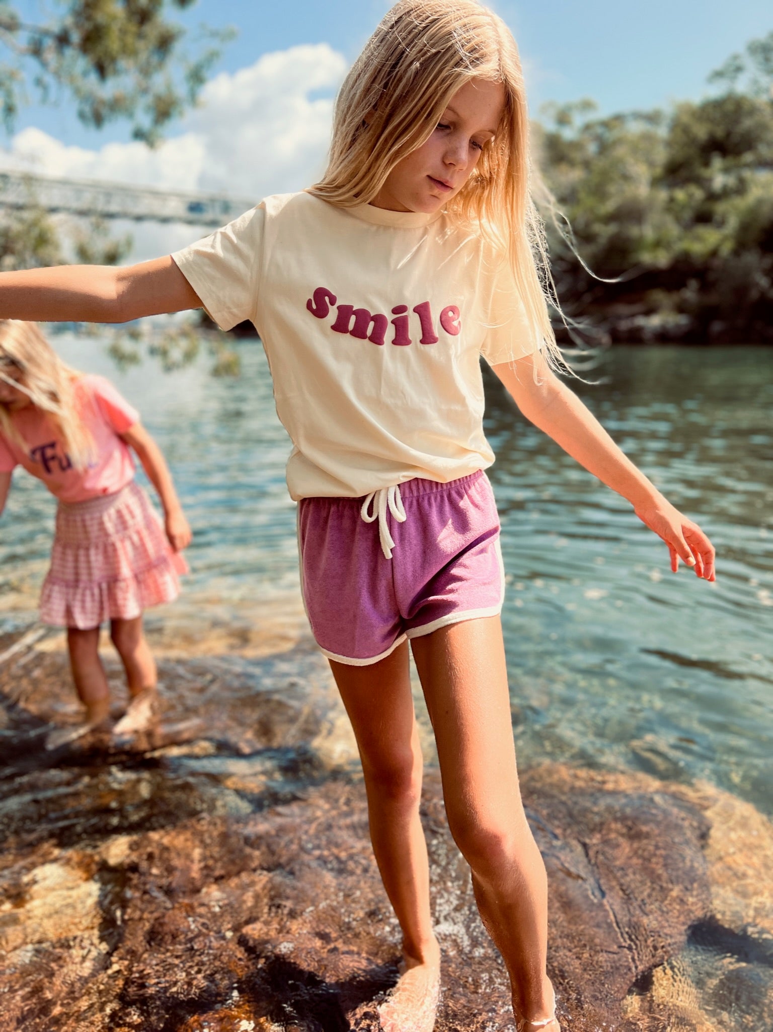 It’s summer - what’s not to smile about?! Classic cut cotton tee with purple puff paint SMILE across front. Looks best worn with a big old smile!