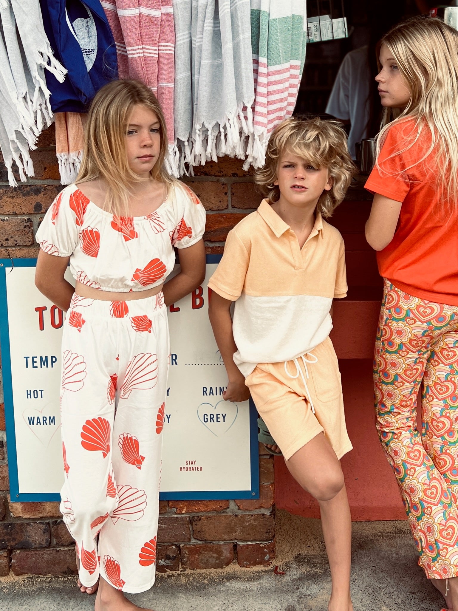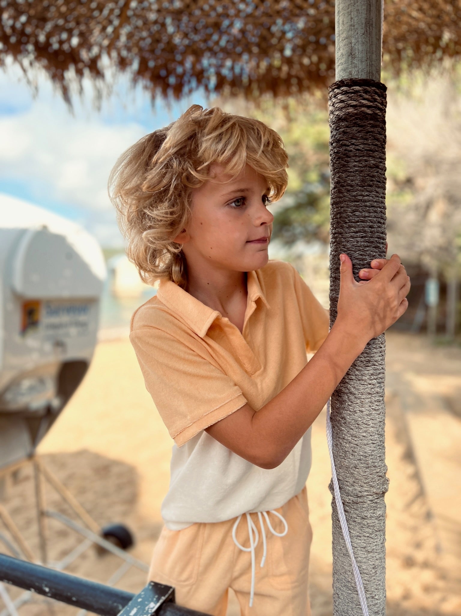 Our classic Terry polo is back, in new delicious gelato pastels! The perfect summer shirt for little dudes. Cool and casual for the beach, but snazzy enough for dinners out too. Go terry all the way and wear back with our Terry shorties or new Terry Long Shorts.